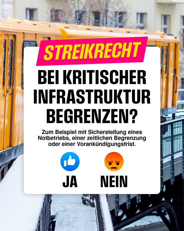 Insbesondere im Bereich der kritischen Infrastruktur beeinträchtigen Streiks unbeteiligte Dritte in erheblichem Maße. Das spüren die Menschen insbesondere beim ÖPNV regelmäßig. Wir sollten uns die Frage stellen, ob es nicht notwendig ist, den rechtlichen Rahmen in diesem sensiblen Bereich zu modernisieren. Möglichkeiten wären: ➡️ eine Mindestankündigungsfrist von 72 Stunden ➡️ eine zeitliche Begrenzung: Die Dauer von Warnstreiks darf 4 Stunden nicht überschreiten. ➡️ ein obligatorischer Notbetrieb, mit dem mindestens 50% des Betriebes aufrechterhalten bleiben Was meinst Du? Braucht es ein moderneres Streikrecht?